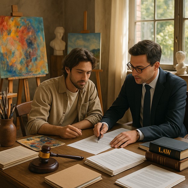 حقوق یک اثر به دو دسته تقسیم میشود: حقوق مادی که جنبه اقتصادی دارد و قابل انتقال است (مانند حق تکثیر و نشر) و حقوق معنوی که به شخصیت هنرمند مربوط است و غیر قابل انتقال است (مانند حق ذکر نام و حفظ تمامیت اثر). یک وکیل قراردادها را بررسی میکند تا مطمئن شود هنرمند فقط حقوق لازم برای یک پروژه مشخص را واگذار کرده و سایر حقوق را برای خود محفوظ نگه میدارد.